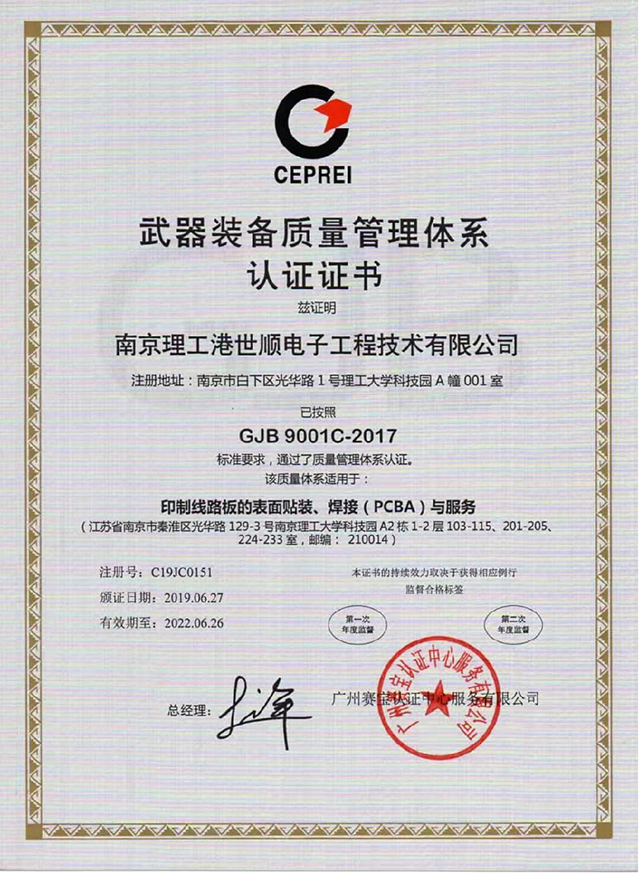 我公司一直注重質(zhì)量的管控,并且多年來一直按照GJB9001體系的要求來執(zhí)行,于2019年6月份取得由廣州賽寶認(rèn)證中心認(rèn)證的武器裝備質(zhì)量管理體系(GJB9001C-2017),我公司的質(zhì)量體系又上一臺階,歡迎有需